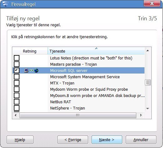 Under Regler kan du lave din egen regel, fx SQL-server Tryk på :