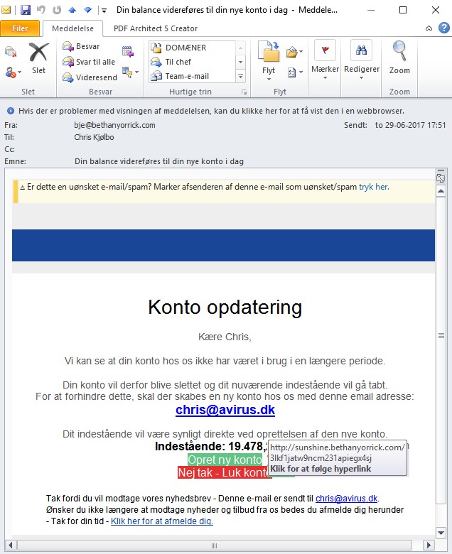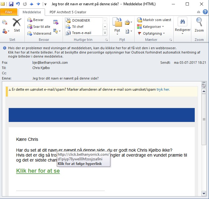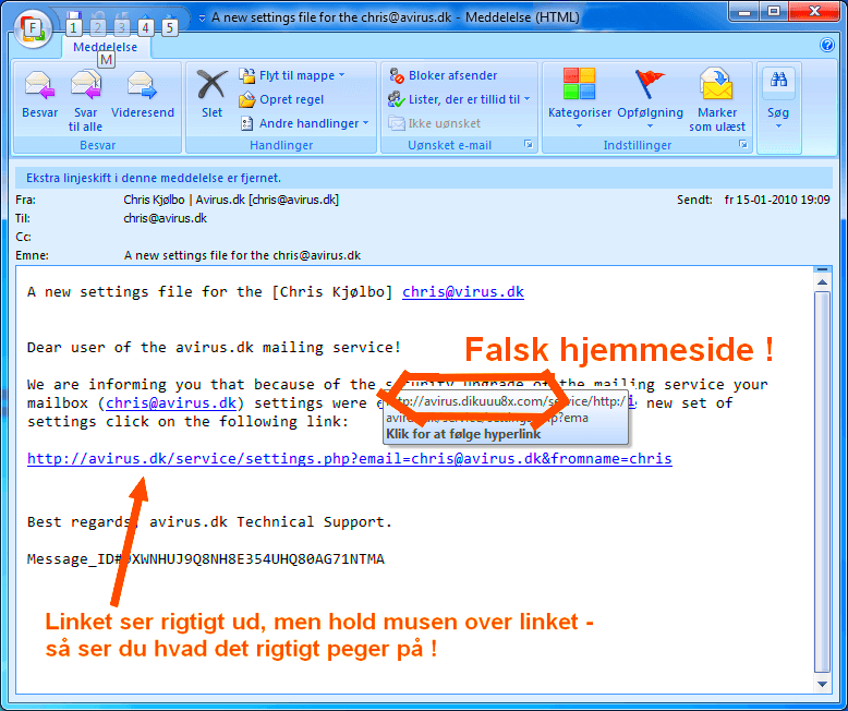 Som du kan se på billedet her, ser den internet adresse rigtig ud, men hvis du holder musen over linket, popper der den rigtige internet adresse op, og den er helt forskellig fra den synlige...