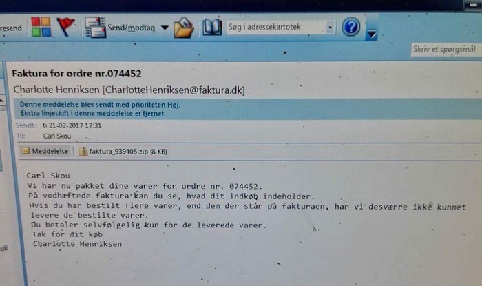 Og her er en herunder, på så godt dansk at alle ville falde i. Det er en CryptoLocker, som - når hvis man åbner og trykker, vil få ødelagt alle sine dokumenter og billeder.. Faktisk alt.. Denne her er der desværre blevet trykket på, og det er endt med at alle filerne på flere Computere er blevet krypteret/ubrugelige, indtil man sender fra ca 800kr til flere tusinde, til dem der har lavet denne virus. Se mere om HOAX - og mere om Phishing.